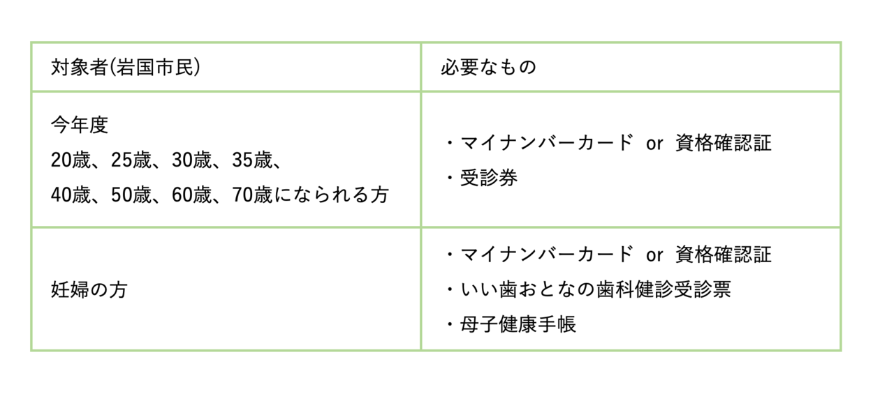 ・今年度20歳、25歳、30歳、35歳、40歳、50歳、60歳、70歳になられる方 (対象の方には、受診券が岩国市より郵送されます)